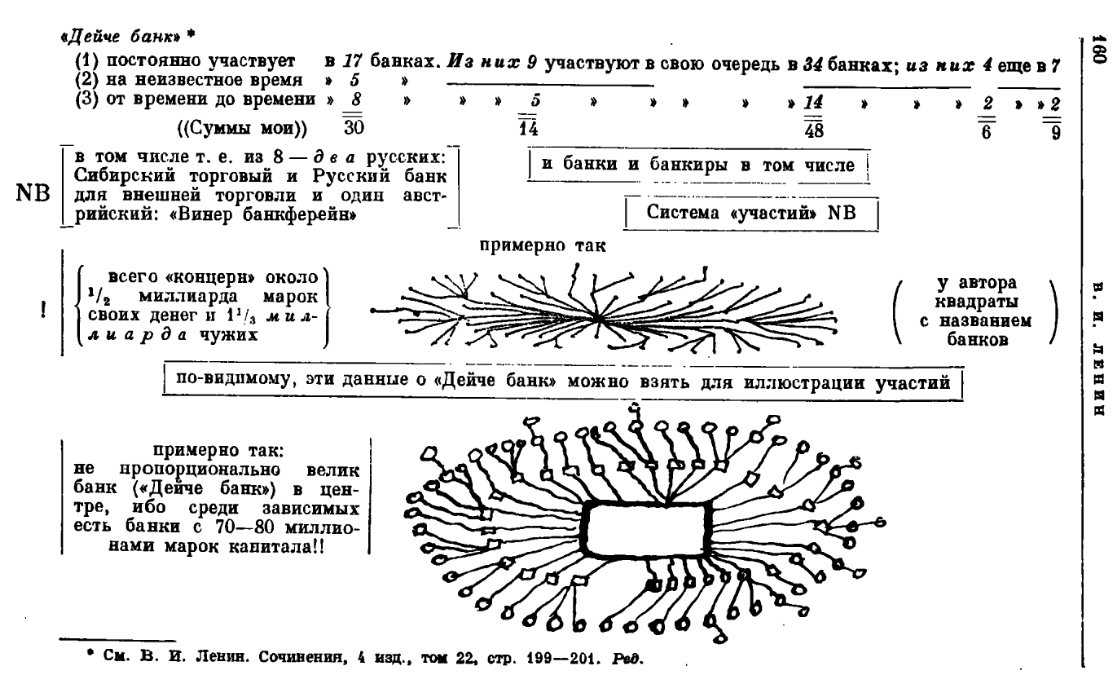 «Руководитель контролирует основное общество» («общество-мать» буквально); «оно в свою очередь господствует над зависимыми от него обществами» («обществами-дочерьми»), «эти последние - над «обществами-внуками» etc. Таким образом можно, владея не слишком большим капиталом, господствовать над гигантскими областями производства. В самом деле, если обладания 50% капитала всегда бывает достаточно для контроля над акционерным обществом, то руководителю надо обладать лишь 1 млн., чтобы иметь возможность контролировать 8 млн. капитала у «обществ-внуков». А если этот «переплет» идет дальше, то с 1 миллионом можно контролировать 16 млн., 32 млн. и т. д.» * (с. 268-9). | лучше, чем у Лифмана, и раньше | |