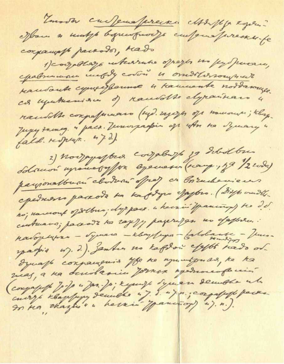 2) Постараться составить за довольно большой промежуток времени (например, за 1/2 года) рациональный сводный отчет с вычислением среднего расхода на каждую статью. (Диеты отдельно; помощь отдельно; случайные расходы и легкий транспорт не должны быть смешаны; расход на газету рассчитан по статьям: наборщики - бумага - квартира - жалованье экспедитору - типография и т. д.). Затем по каждой статье надо обдумать сокращения уже не примерные, не на